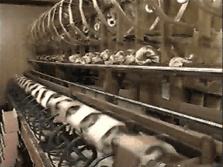 て、上下に分かれた目はじきを通り、目板を通って、畦筬(あぜおさ)で糸が1本ごとに交差するように畦を取る。次に前筬(まえおさ)で経糸の幅を整え、ドラムに巻き取る。必要な長さで糸の束を切り、端を結び、おやまと言われる輪を作って、ドラムにピンで留める。そして畦取り台をずらし、糸の束を再びドラムにかけ、巻き取る。この一歩きを何回か繰り返すことで必要な本数の経糸が揃う。ドラムに巻き取られた糸は、今度は千切(ちきり)と呼ばれるロールに移し取る。千切は、ドラムと違ってロールの直径が小さいため、糸同志がからみつかないように、一巻きごとに機草(はたくさ)と呼ばれる厚紙をはさみ込む。千切に糸がすべて巻き取られると、整経は完了する。 |
