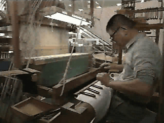 と、次は棒刀吊りという作業にかかる。棒刀板と呼ばれる平らな木の板を、輪にしたカタン糸に通す。カタン糸の輪に通した棒刀板に、紐をかけ、目板に通し、ほかの棒刀板と同じ高さにして、それ以上、下がらないように目板の所でまず固定し、紐で上から吊り下げる。ジャカードから来る経糸への指令は、通糸単位のものと棒刀単位のものがあることがわかる。 |